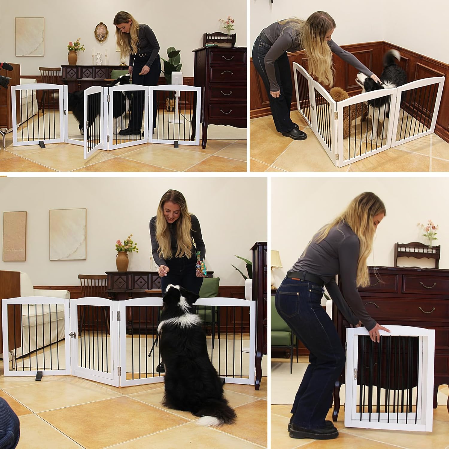 - 【Collapsible and Expandable Design】 ZJSF's dog gate is freestanding and can be folded out into the wide z-shape that allows you to use it in full indoor, double gate, or standard doorways, bedrooms, staircases or anyplace in your house.