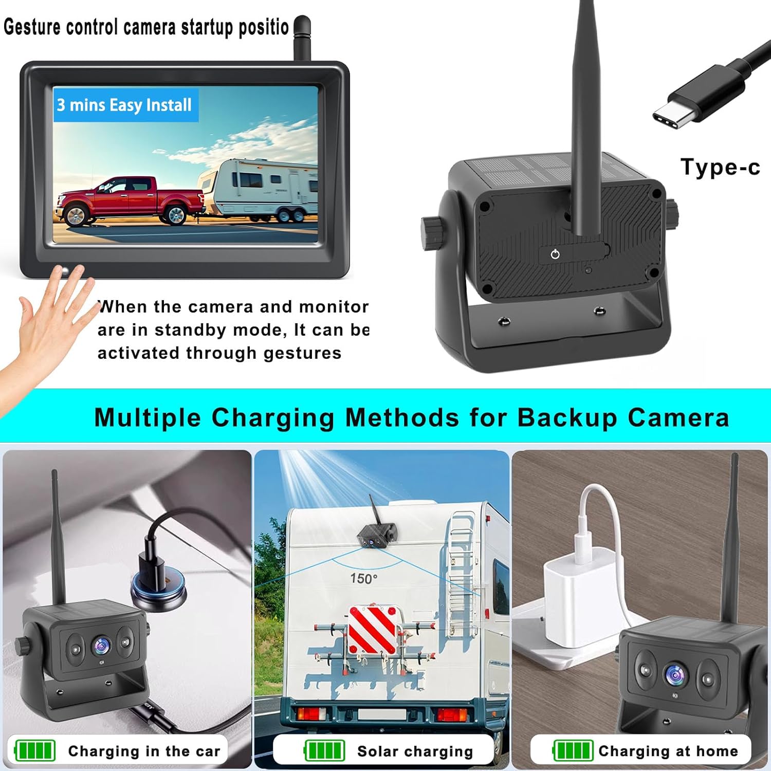 - Gesture control & Energy-Saving: The screen will automatically turn off when you don't need it. The car backup camera wireless will quickly enter the energy -saving sleep mode around 10s. You no longer need to manually turn off the rv camera power supply, which will reduce the charging frequency of trailer camera. it has a longer battery life, When the hand is within 4inch of the “Gesture control camera startup positio”, shake the hand 3 times to activate the display screen and camera.