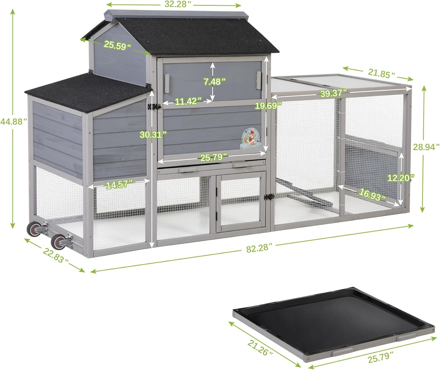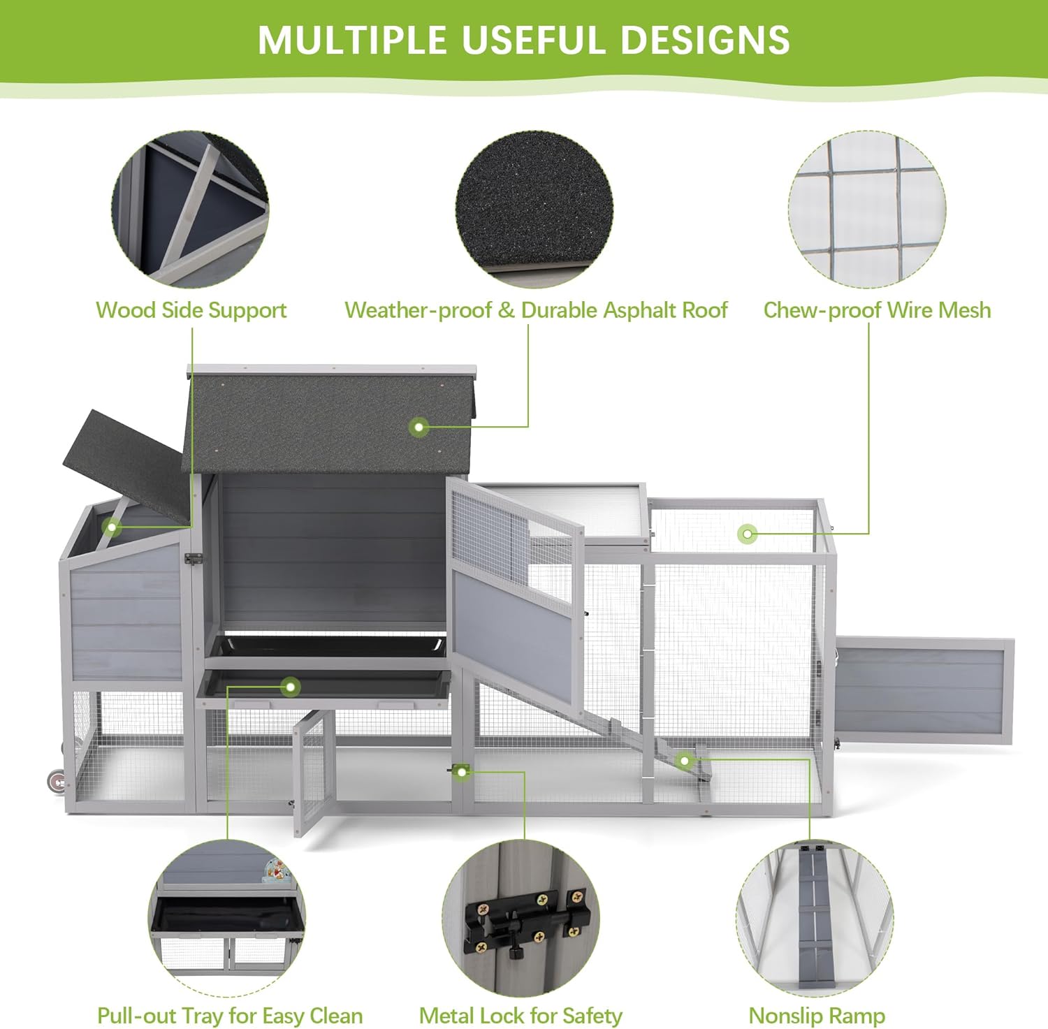 - 【Chicken Coop with Ample Space】: Measuring 82.29 inches in total length, this chicken coop provides chickens with a spacious living area and run area on the ride side for free roaming and exercise freely, suitable for 2 adult chickens or other similar sized pets.