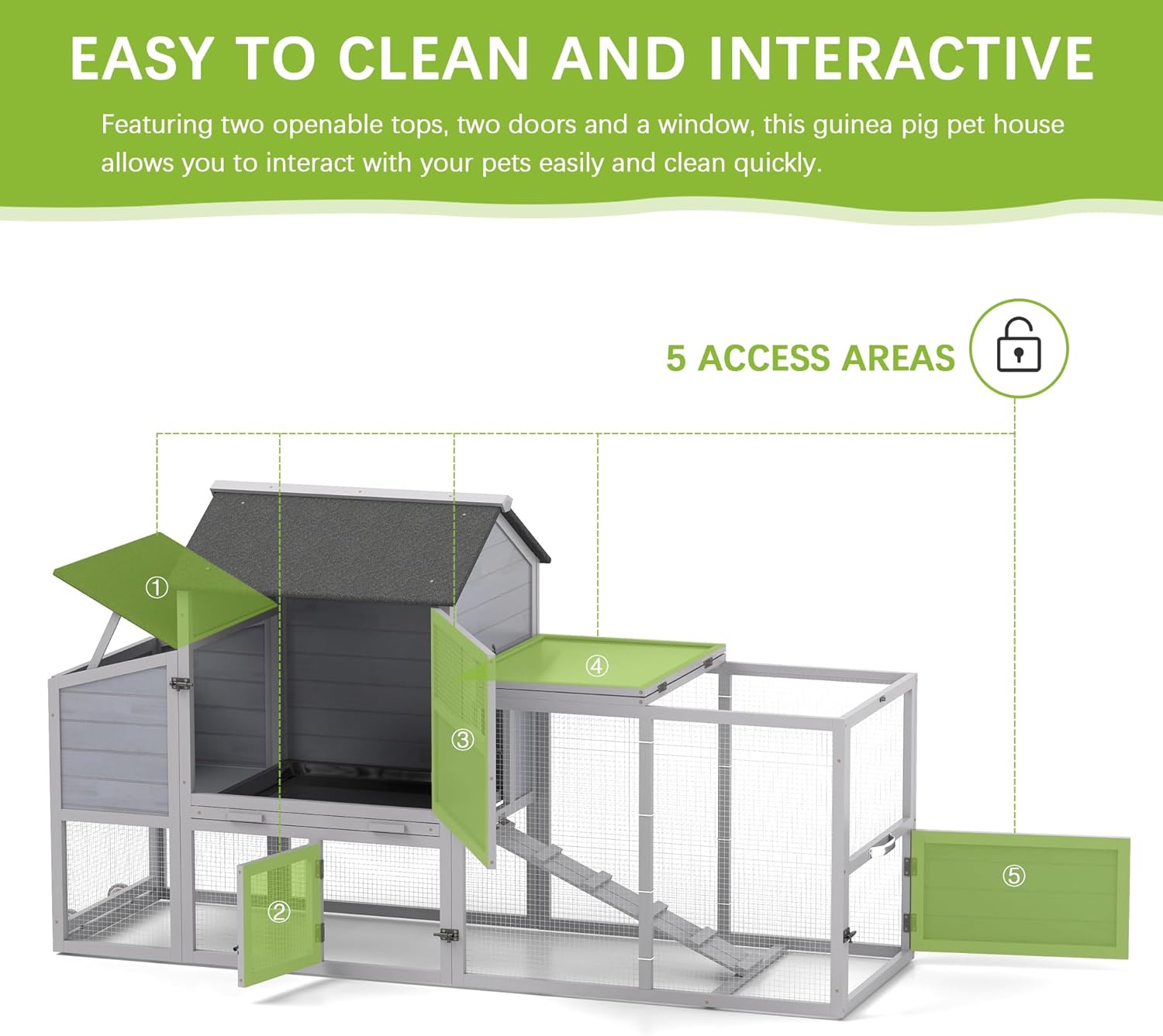 - 【Easy to Clean and Interactive】: Featuring two openable tops, two doors and a window, this guinea pig pet house allows you to interact with your pets easily and increase intimacy. The pull-out tray and egg crate with wheels design make cleaning quick and easy.