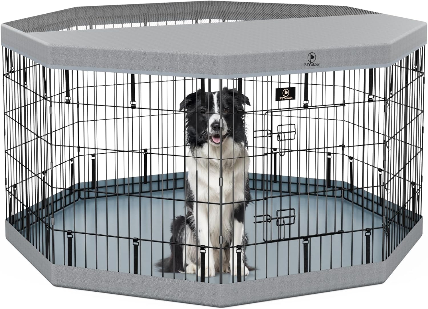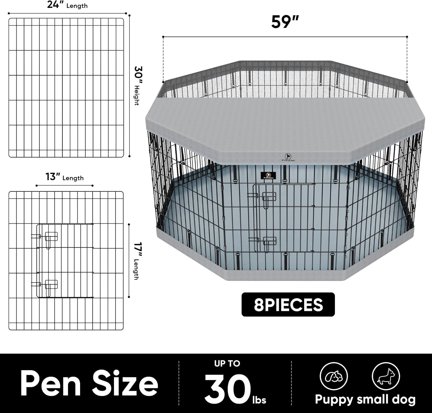 PJYuCien Dog Playpen, 8 Panels 30”H Dog Playpen Indoor with Grey Bottom Pad and Top Cover, Metal Foldable Dog Pen for Indoor Use, Better for Small Medium Animals, Grey