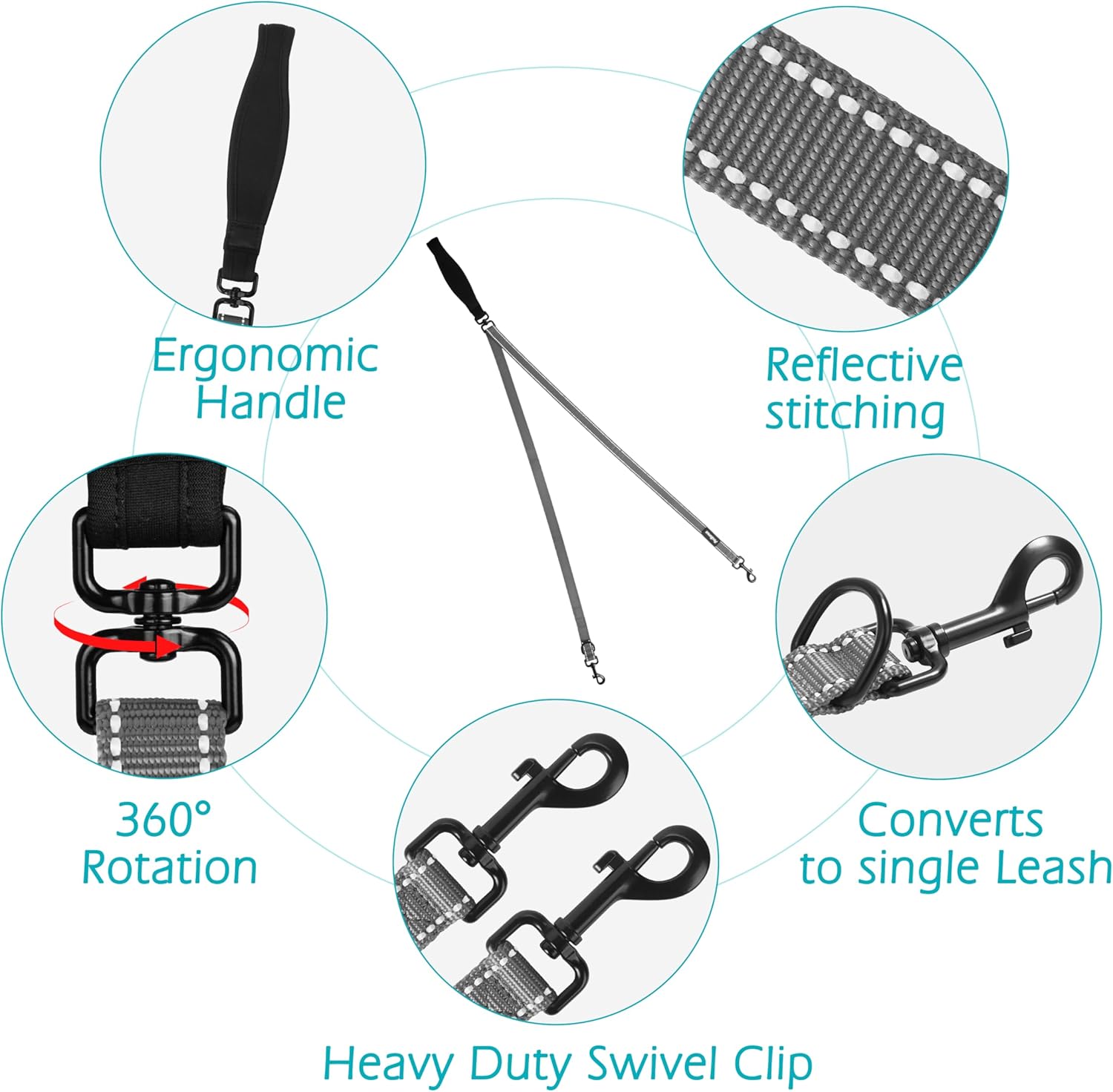 PetBonus Two Point Control Dog Leash, Works with No Pull Harnesses, No Tangle Dog Training Leashes, No Pull Padded and Reflective Walking Lead, Converts to Single Leash for Medium Large Dogs (Grey)