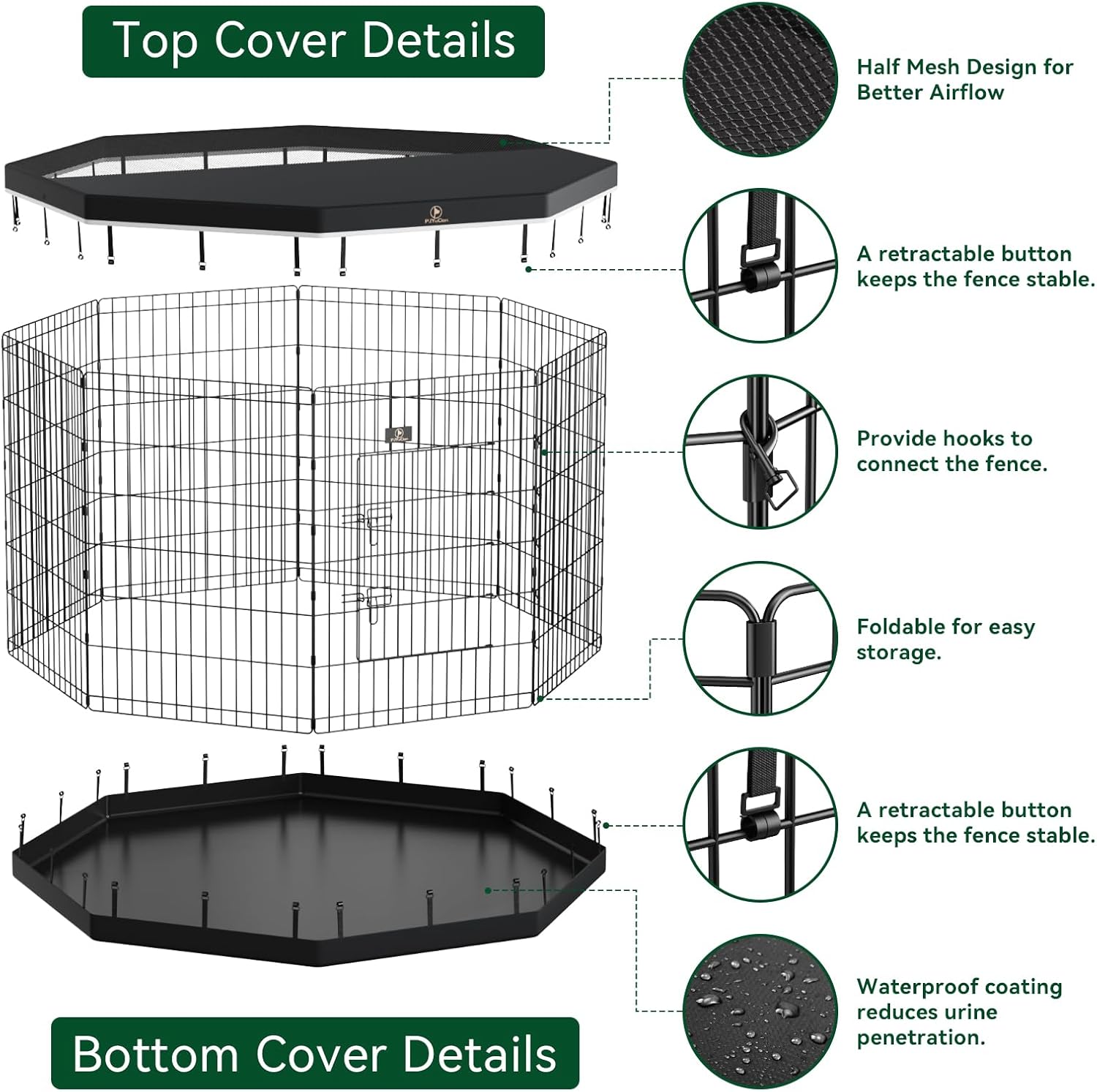 - 420D Oxford & Mesh Top Cover: The dog playpen cover features a dual-sided design with 420D oxford fabric on one half and mesh on the other. It has four adhesive tape connection points on each side, making it easy to assemble and disassemble. It can be used outdoors for sunshading and air circulation, and indoors to prevent pets from escaping. This cover is only suitable for octagonal combinations. Please note that our cover cannot be deformed.