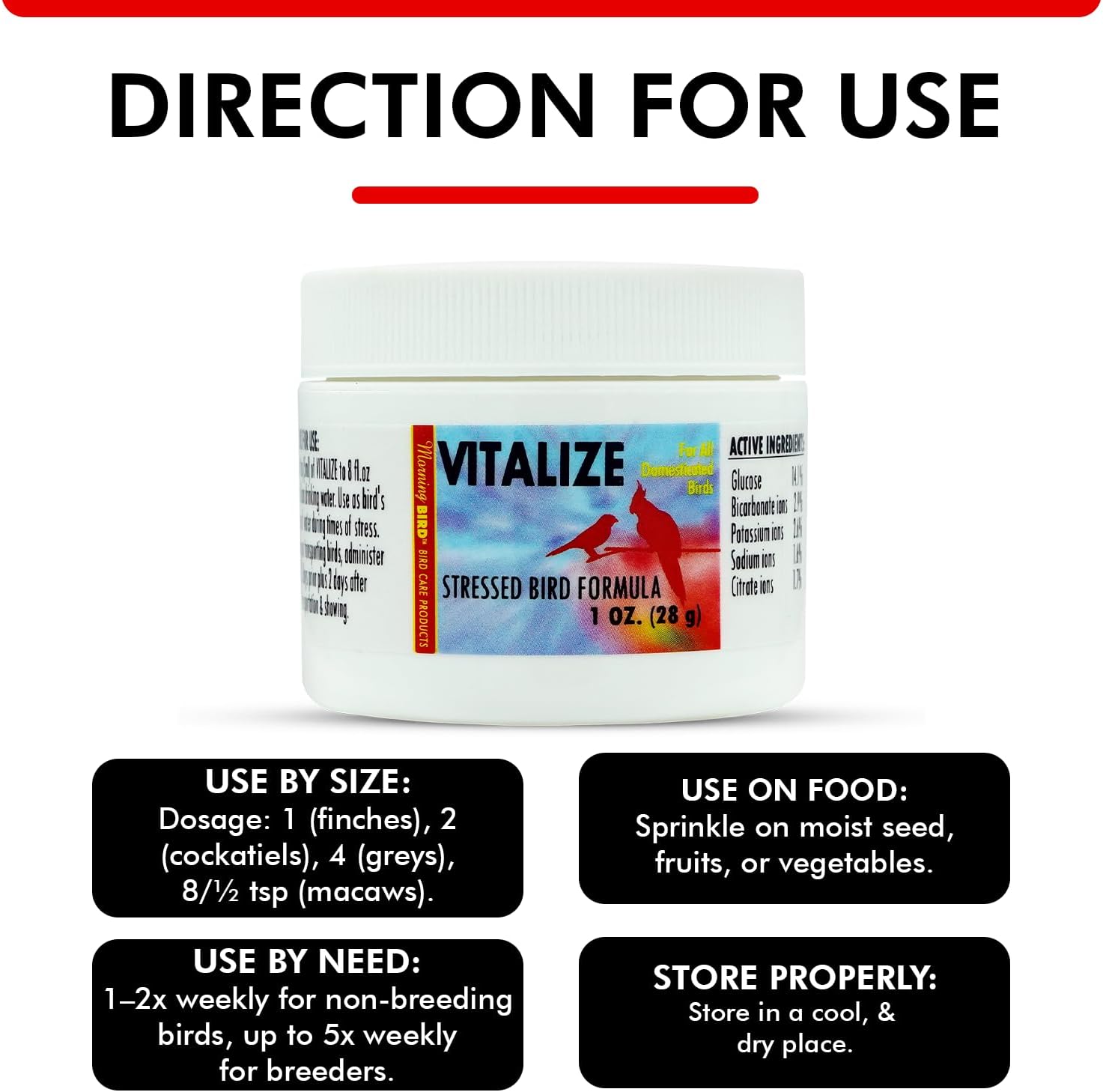 Morning Bird Vitalize, Supplement for Sick, Injured, or Stressed Caged Birds; Dehydration and Exhaustion Treatment for Parakeets, Cockatiels, Budgies, Finches, Canaries, and Parrots, 1 oz