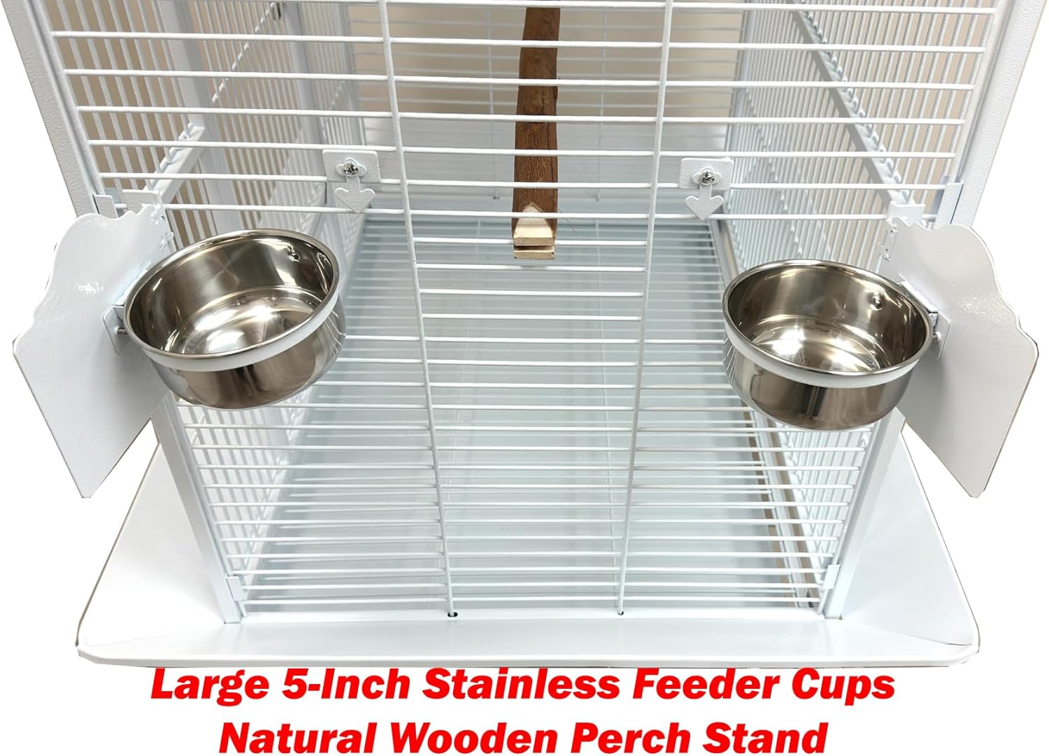- 【Swivel Solid Metal Feeder Doors】 Prevent Spillage With Two Large 5" Stainless Steel Feeder Cups , Inside Natural Wooden Stand Perch Included.