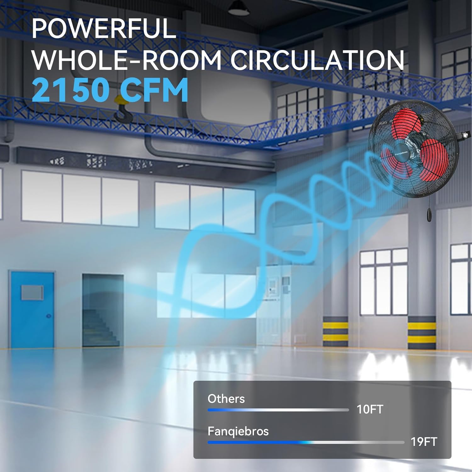 - 𝐇𝐢𝐠𝐡 𝐕𝐞𝐥𝐨𝐜𝐢𝐭𝐲 𝐀𝐢𝐫 𝐅𝐥𝐨𝐰 - Equipped with 3 adjustable wind speeds, low (1700CFM), medium (2100CFM) and high (2500 CFM), this wall fan utilizes the raw power of the pure copper motor to provide hurricane-like airflow to meet your garages, shops, covered patios, or anywhere else you need