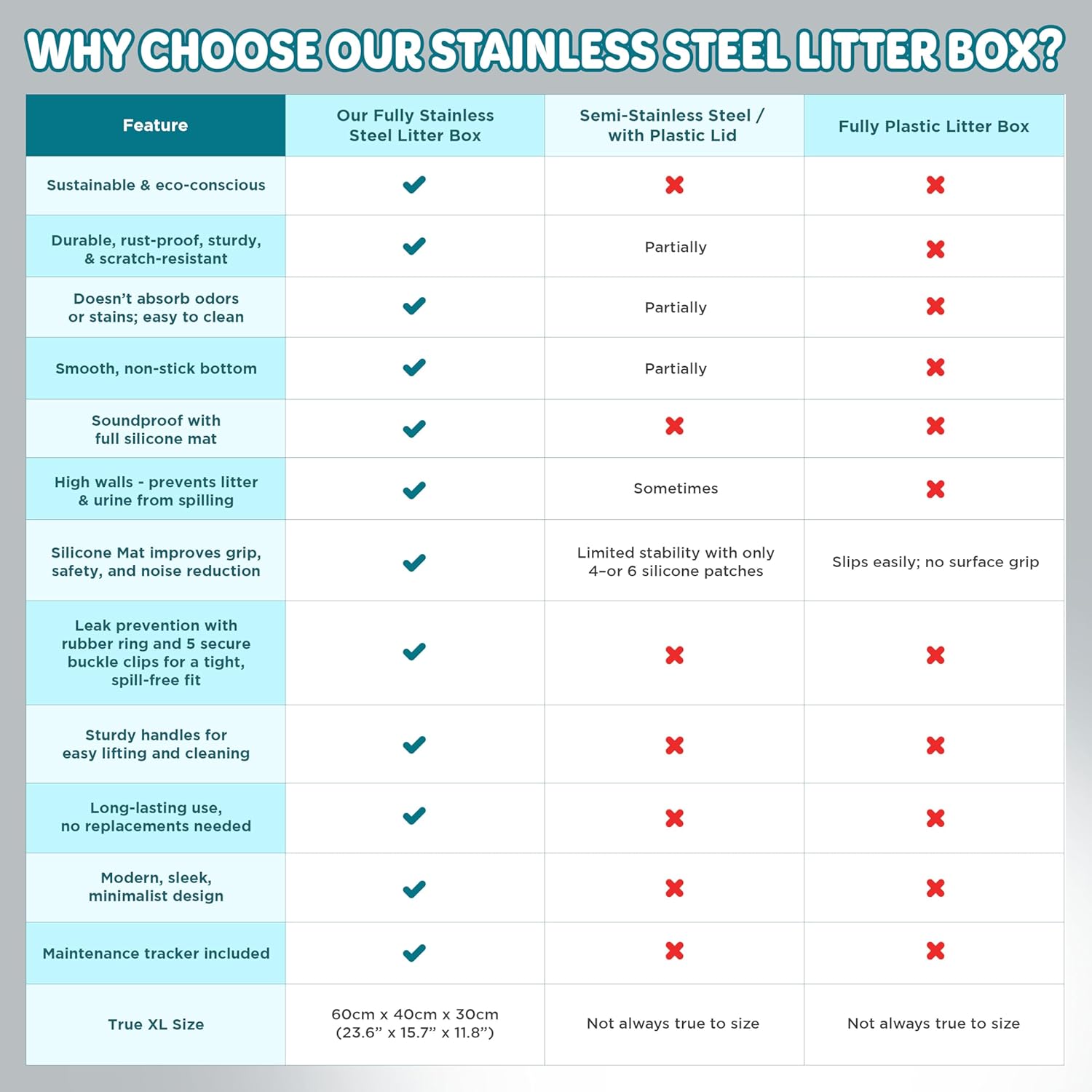 - Quiet & Stable –Unlike other stainless steel litter boxes, this stainless steel enclosed litter box features a full silicone mat underneath, absorbing noise and vibrations to reduce loud scratching sounds. The non-slip, pet-safe silicone base keeps the steel cat litter box firmly in place, ensuring stability and a peaceful experience for both you and your cat.