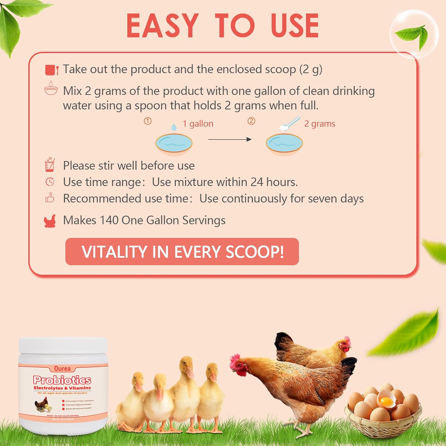 - Boost Immunity & Stress Resistance: In the face of environmental changes and disease risks, every chicken needs protection. Ourea formula is rich in essential vitamins A, D, E, and C, probiotics, and poultry electrolytes to strengthen the immune system, help poultry fight off illnesses, and adapt to stress, keeping your flock strong and full of vitality