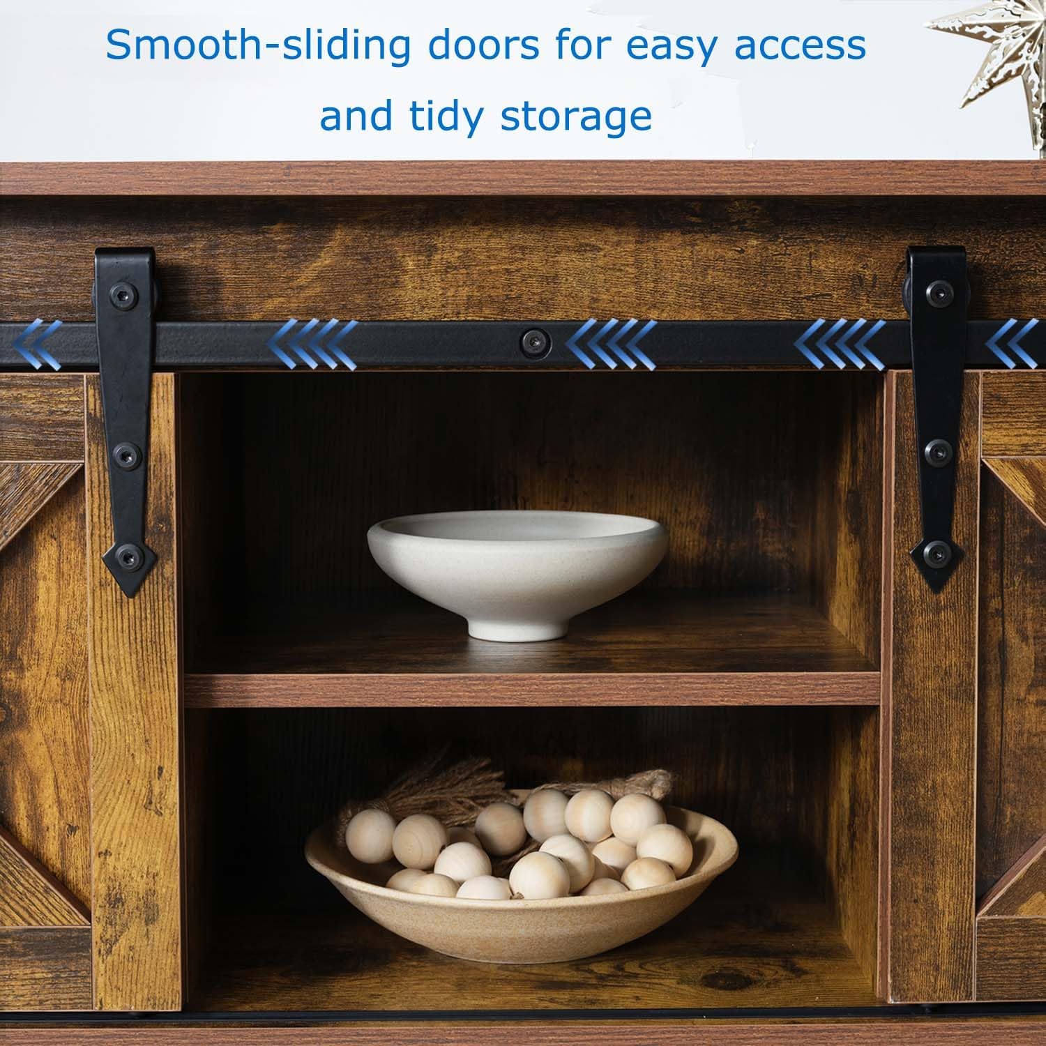 - Sliding Barn Doors & Ample Storage: Features rustic sliding barn doors with adjustable shelves, providing organized storage for kitchen essentials, making it an ideal buffet cabinet or coffee bar
