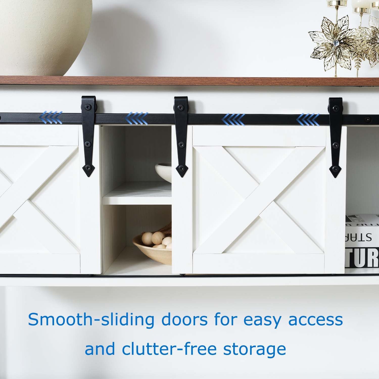 - Sliding Barn Doors & Ample Storage: Features rustic sliding barn doors with adjustable shelves, providing organized storage for kitchen essentials, making it an ideal buffet cabinet or coffee bar