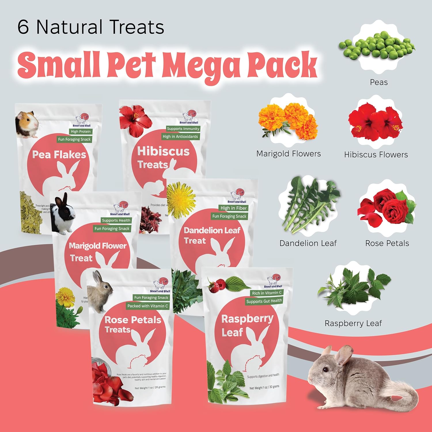 Snout and Shell Small Pet Mega Pack – 6 Natural Treats: Pea Flakes, Dandelion, Raspberry Leaf, Marigold, Rose Petals & Hibiscus – For Rabbits, Guinea Pigs, Chinchillas & More – Foraging & Health Boost