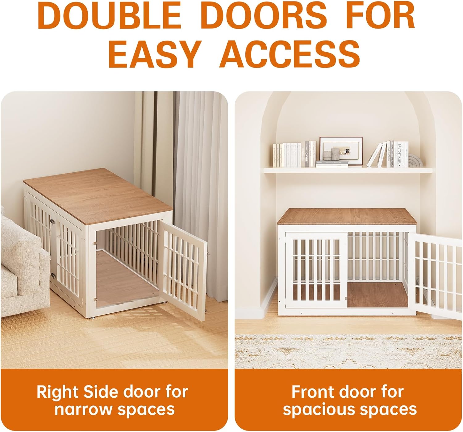 - 【Double Doors Design】The dog kennel furniture has a front door and a side door, your pet will go in and out easily with double doors. The double-doors design can adapt to more different space environments. You can decide whether to open the front door or the side door according to your needs.