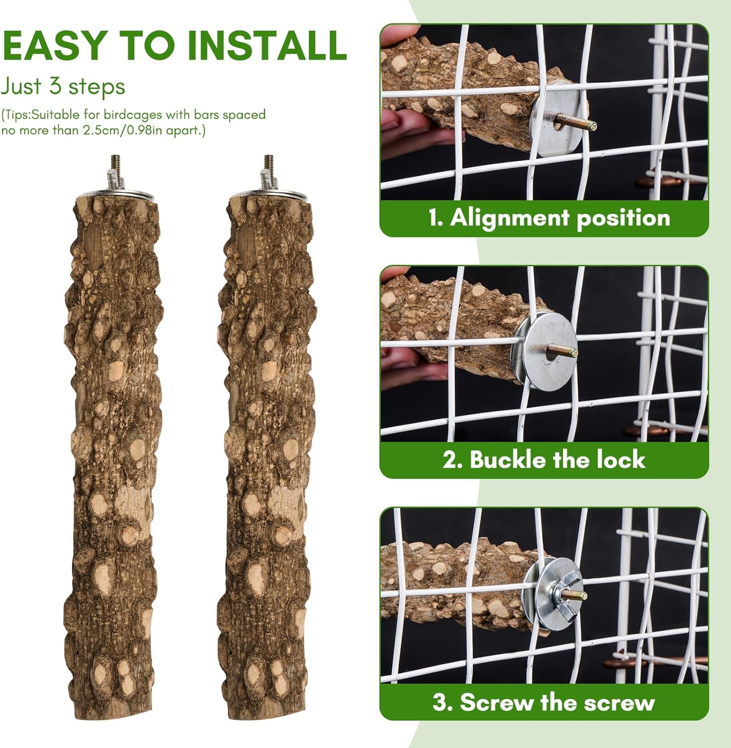 - Non-Slip: The bird perches are made from natural wood with visible grain patterns that provide a stable standing surface for birds while also serving as a toy for claw-grinding.
