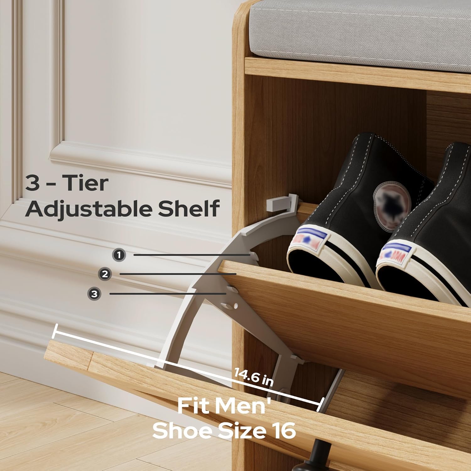 - Flexible Shoe Storage Space: With an adjustable and removable shelf in the drawers, this entry bench allows you to customize the space for different types of footwear. Whether it’s slippers or sneakers, our farmhouse shoe bench ensures that all your favorite shoes have a dedicated home