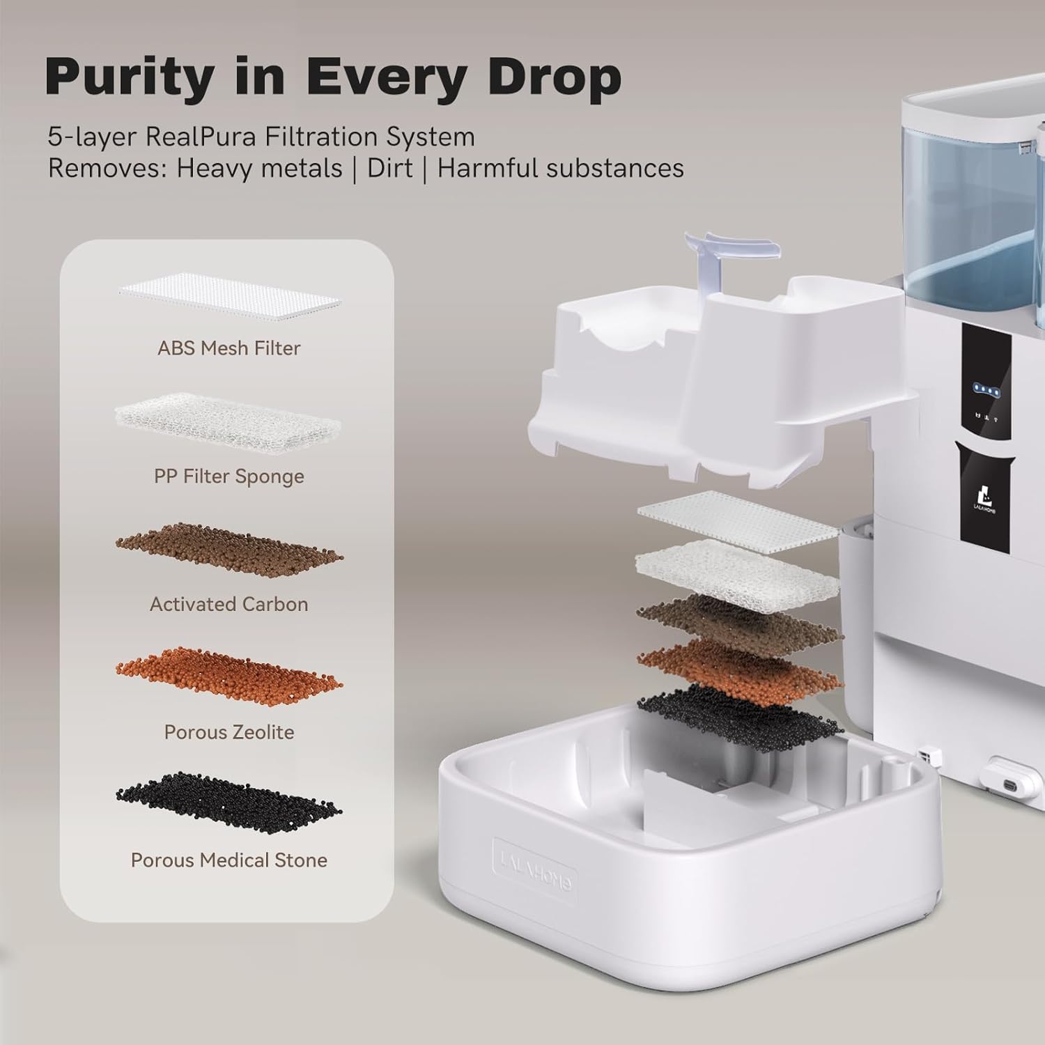 - Cleaner Water with the Unique 5-Stage Filtration: LALAHOME cat drinking fountain stands out with 5-stage filtration system: Water gets pre-filtered through a mesh screen, trapping hair and gunk in a sponge filter. Then it’s pushed through activated carbon, zeolite, and finally cleaned by the maifan stone. It can effectively filter and diminish the hair, impurity, odor, and chlorine. The filtered water dispenser can give cleaner water to pets and reduce the risk of developing illness.