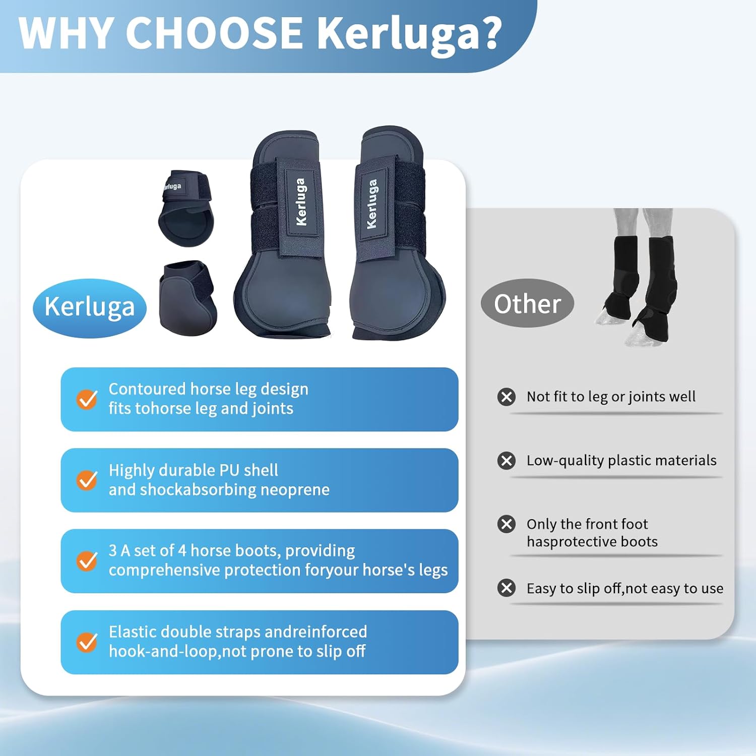 - SHOCK ABSORPTION & PROTECTION: The Professional Shock Absorbing Horse Boots are made of a highly durable PU shell and shock absorbing Neoprene, give horse extra tendon support and heavy-duty protection from his back hooves, keep their vulnerable tendons and ligaments well protected for a long time. Perfect for Horse Show Jumping Tendon Boots needs