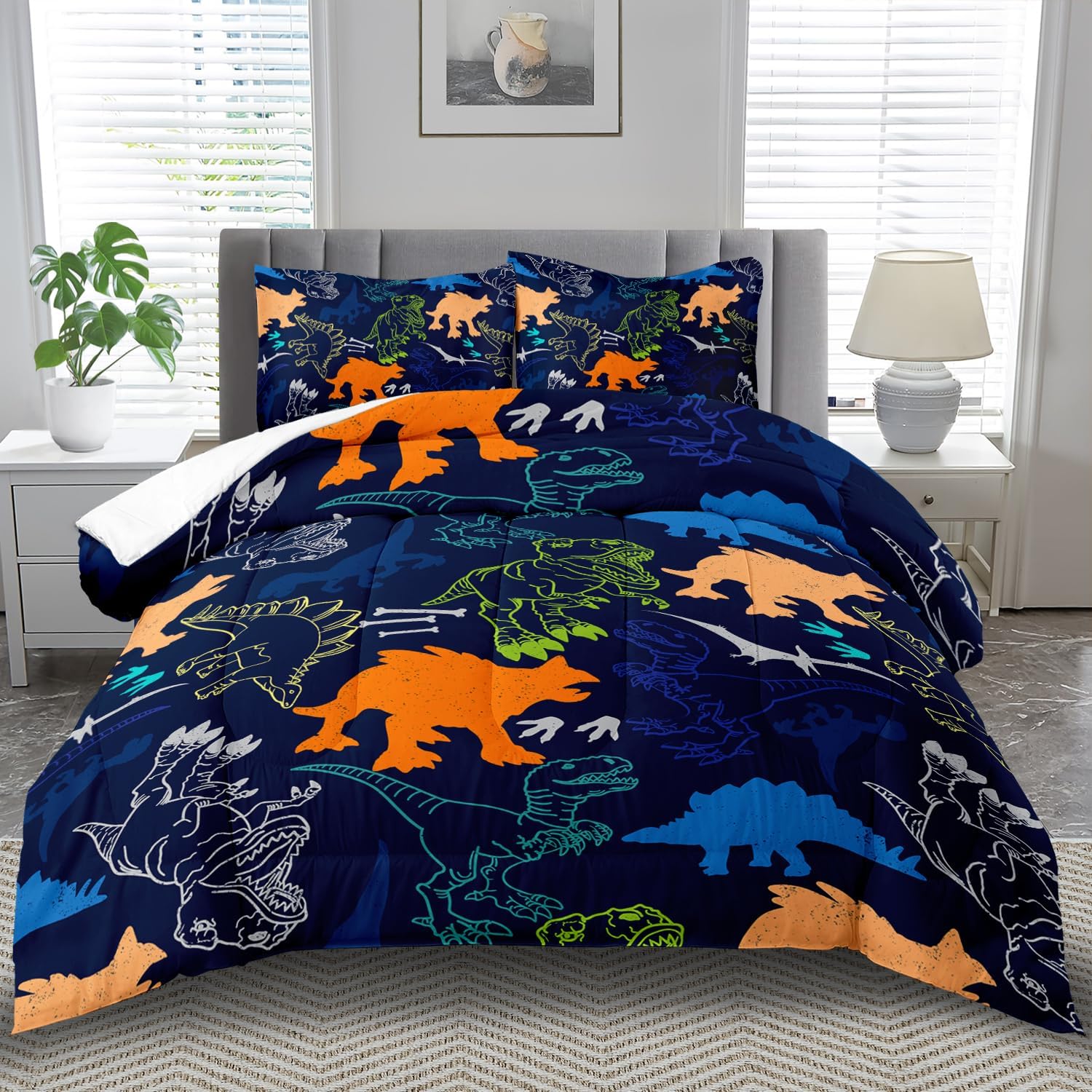 - Queen Size Blue Cartoon Dinosaur Comforter Set :This bedding set includes 1 comforter(67" x 85") and 2 pillowcases(20”x30”). In order to facilitate transportation, the quilt is made of vacuum compression technology. It will be slightly wrinkled when taken apart, but it will quickly regain its fluffiness if you gently beat it.