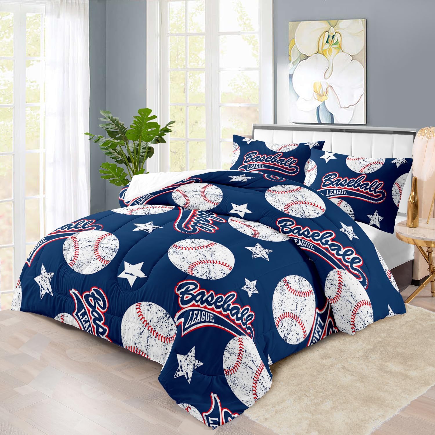 - Full Size Baseball Comforter Set :This bedding set includes 1 comforter(67" x 85") and 2 pillowcases(20”x30”). In order to facilitate transportation, the quilt is made of vacuum compression technology. It will be slightly wrinkled when taken apart, but it will quickly regain its fluffiness if you gently beat it.