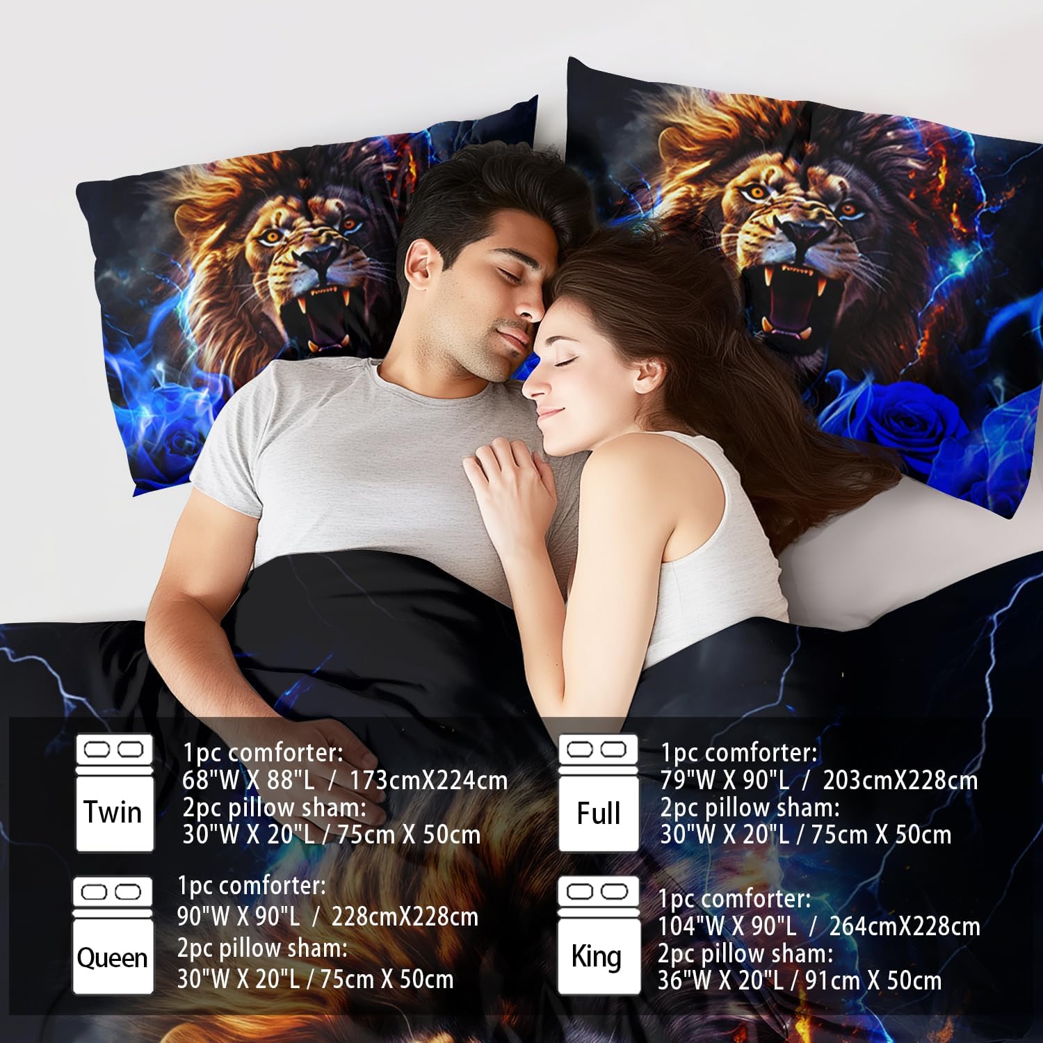 - Queen Size Fashion Lion Comforter Set :This bedding set includes 1 comforter(67" x 85") and 2 pillowcases(20”x30”). In order to facilitate transportation, the quilt is made of vacuum compression technology. It will be slightly wrinkled when taken apart, but it will quickly regain its fluffiness if you gently beat it.