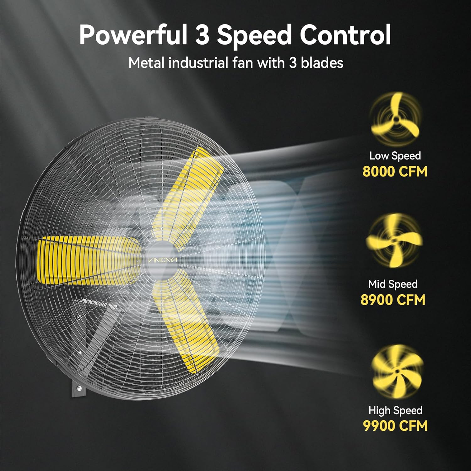 - 3 Speed Control: Offers three speed settings (low-8000 CFM, medium-8900 CFM, and high-9900 CFM) to allow you to customize the airflow intensity based on your specific cooling or ventilation requirements on the wall mount fan